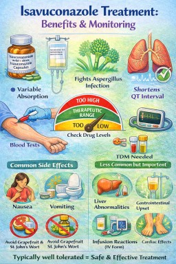 “Adult with chronic lung disease, on itraconazole 200 mg daily, recent CT shows cavities, asking about monitoring and side effects.”
