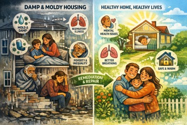 Cooler climates limit mould growth; strong building codes reduce damp housing.