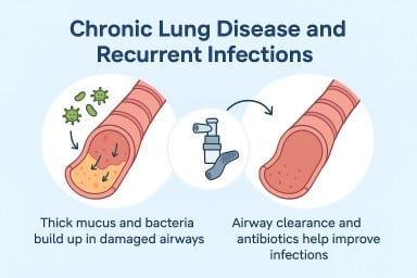 In bronchiectasis and aspergillosis, parts of the lung don’t drain properly, so infection pockets linger. -
