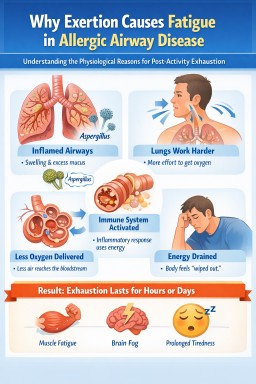 - Many people with aspergillus-related lung conditions experience extreme tiredness after physical or mental exertion.